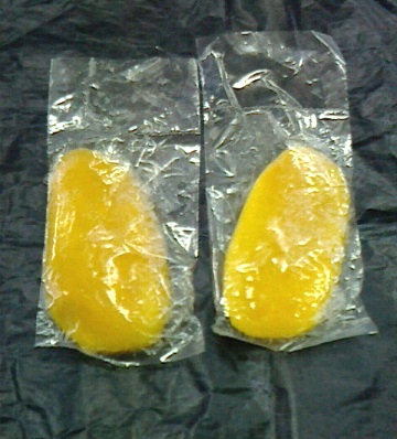 ↑個別包装されたマンゴーのハーフカットが1パックあたり7~8個入ってます。